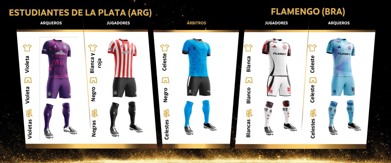 Do outro lado da cancha, o Estudiantes segue da mesma forma. Nas camisas de linha, o time argentino vai usar o tradicional listrado em preto e vermelho, com calções e meiões pretos. O goleiro, por outro lado, estará inteiramente vestido de roxo.