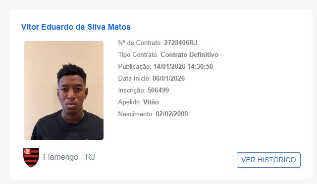 O registro do Flamengo veio minutos após o próprio Internacional, antigo clube de Vitão, registrar a rescisão de contrato no BID. Com o caminho livre, o Mais Querido não perdeu tempo e incluiu o nome do jogador.