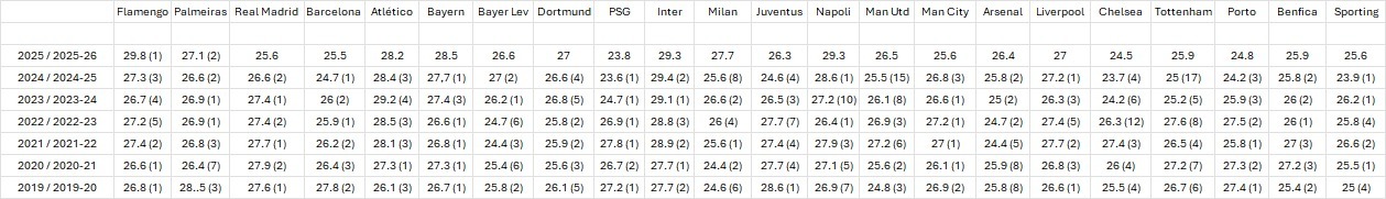 1. Apenas 14 times das ligas Big 5 tiveram média de idade acima de 29 anos entre as temporadas 2019/20 e 2024/25: