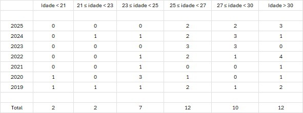 Tabela com o número de jogadores contratados em cada faixa etária entre 2019 e 2025. Inclui totais por categoria, mostrando quantos atletas foram adquiridos em cada grupo de idade ao longo do período.