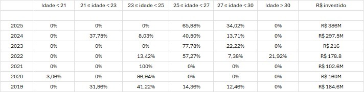 Tabela mostrando a distribuição percentual das contratações por faixa etária de 2019 a 2025, com colunas para seis grupos de idade e uma coluna final de valores investidos. Os percentuais variam por ano, indicando em quais faixas etárias o clube mais gast