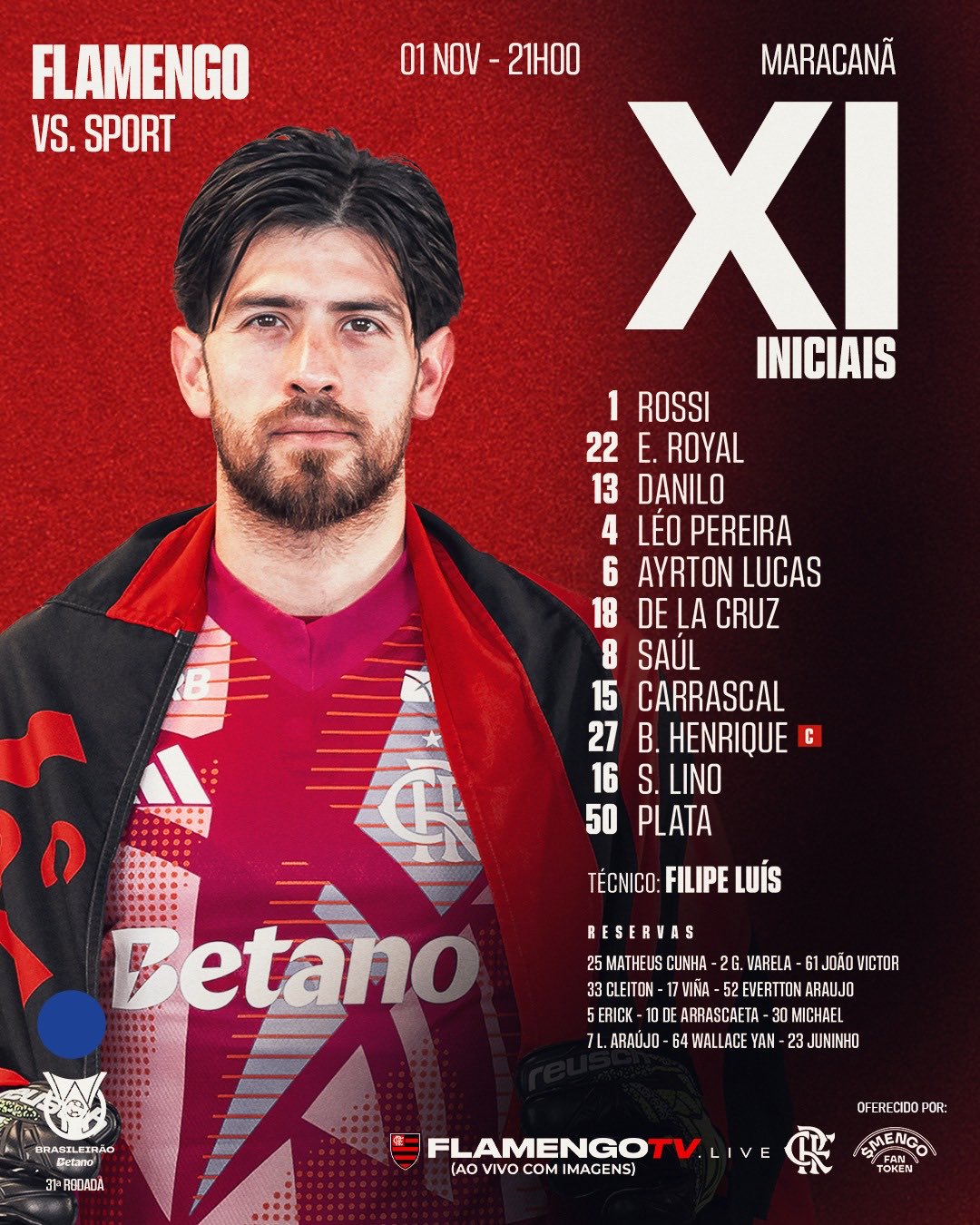 Cheio de mudanças, o Flamengo está escalado para enfrentar o Sport, neste sábado (1º), no Maracanã. O técnico Filipe Luís fez uma série de alterações na equipe que superou o Racing na Libertadores, seja por precaução ou lesão. Samuel Lino está de volta ao time titular, assim como Saúl Ñíguez. Arrascaeta deixa o onze inicial.