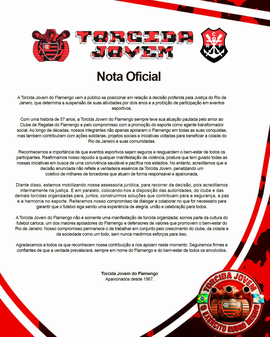 Suspensa por dois anos de qualquer evento esportivo após decisão do Juizado Especial do Torcedor e dos Grandes Eventos, na última terça-feira (15), a Torcida Jovem do Flamengo se manifestou. Nesta quarta, a organizada publicou nota oficial e garantiu que vai recorrer da decisão, considerada injusta.