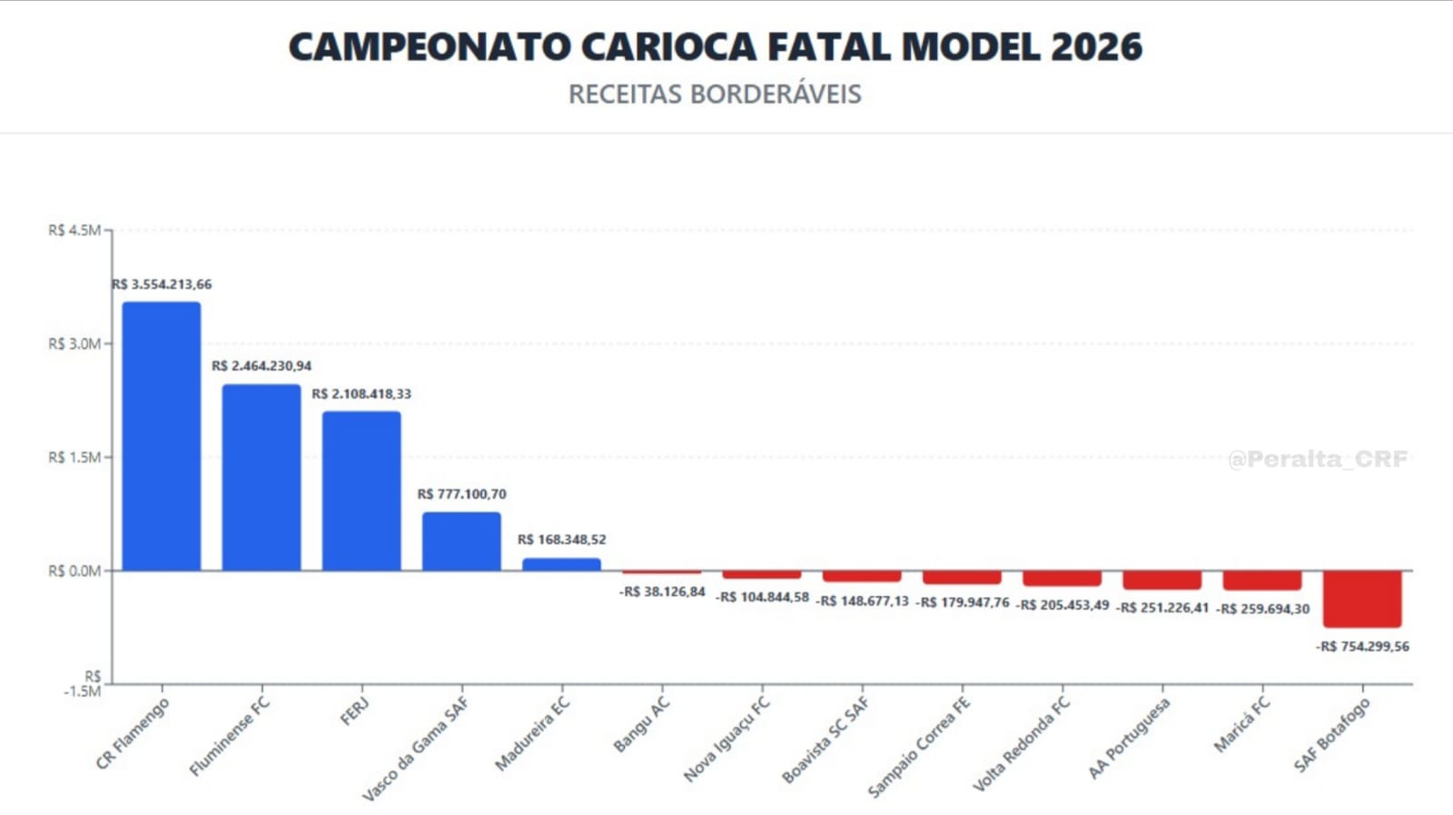 O Flamengo fechou o campeonato com um lucro agregado de R$ 3.554.213,66. Este valor é superior ao faturamento líquido da própria Ferj em todo o torneio, que foi de R$ 2,1 milhões. Ou seja, o clube arrecadou sozinho cerca de 43% a mais do que a federação conseguiu extrair de todos os 12 clubes participantes somados.