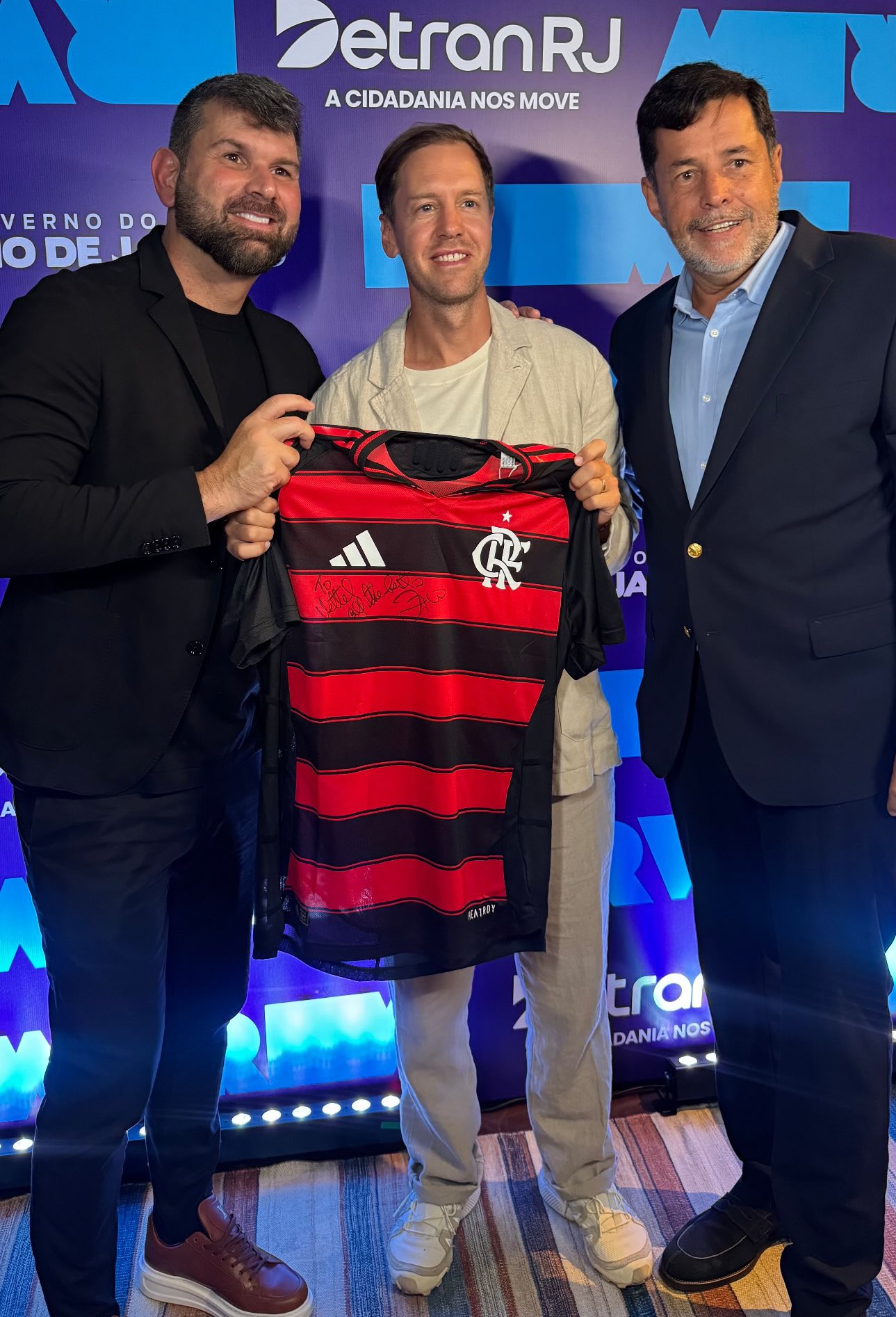 Antes do evento começar, porém, Vettel posou para uma série de fotos com os presentes e aproveitou para autografar uma camisa do Flamengo. Logo em seguida, posou para um registro segurando o Manto.